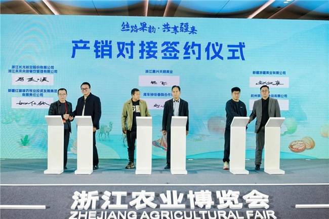 在产销对接签约环节,浙江长龙航空、未来央厨、嘉兴天顺果业、杭州姚生记等浙江企业与阿克苏多家农产品企业达成合作意向,现场签署多项采购协议,进一步巩固了阿克苏农产品在浙销售网络。